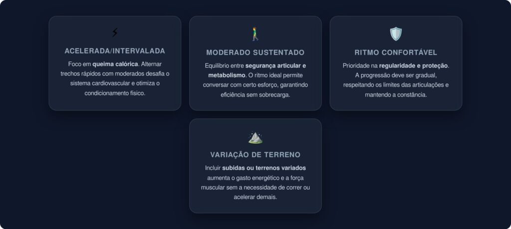 - Acima de 60 anos: caminhada em ritmo confortável com progressão gradual é indicada, priorizando a regularidade e a proteção das articulações