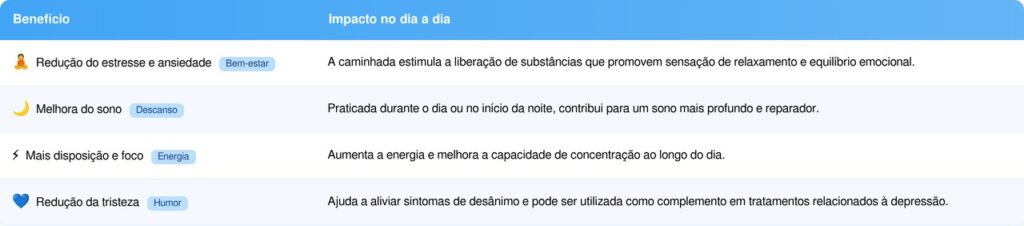 Os efeitos da caminhada vão muito além do corpo físico. Alguns dos benefícios mais percebidos no dia a dia incluem: