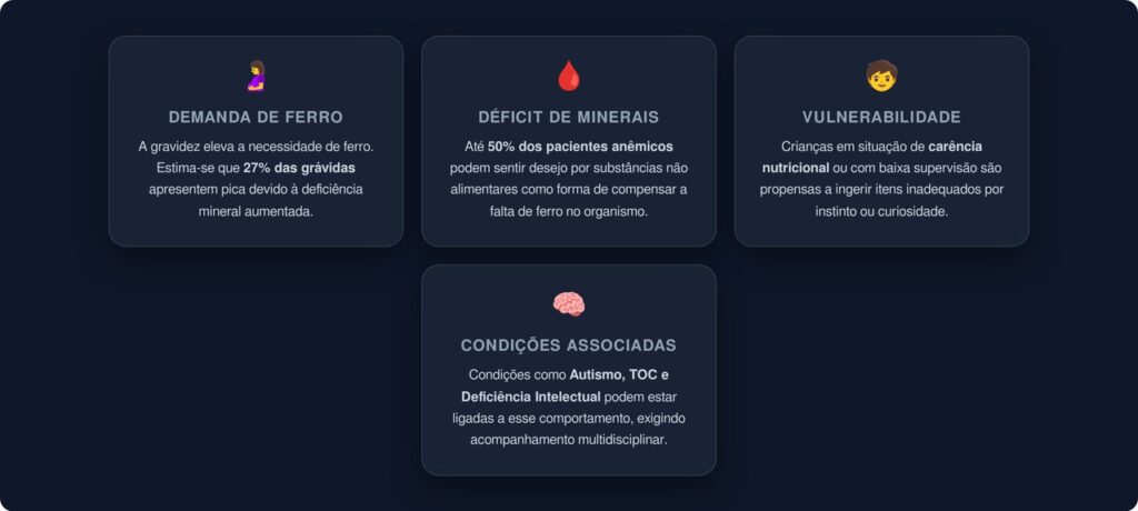 - Gestantes: a demanda aumentada por ferro durante a gravidez eleva o risco de deficiência, e estima-se que cerca de 27% das grávidas apresentem comportamentos de pica