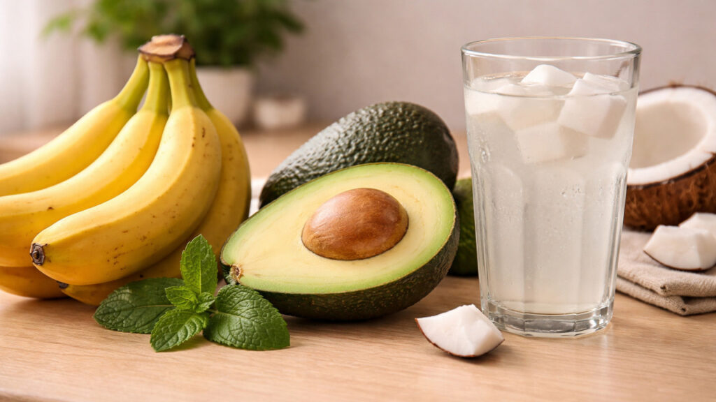 - Água de coco: uma forma natural e refrescante de repor potássio e manter a hidratação ao longo do dia.