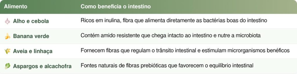 Não basta introduzir bactérias benéficas no intestino. É preciso alimentá-las para que sobrevivam e se multipliquem. É aí que entram as fibras prebióticas, presentes em alimentos do dia a dia que muitas vezes já fazem parte da sua cozinha. Veja os principais: