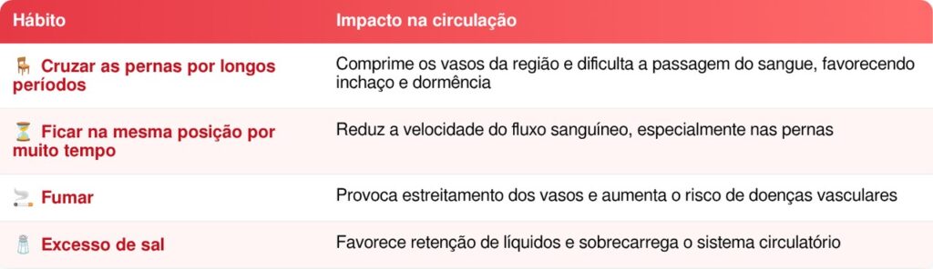 Algumas atitudes do cotidiano podem atrapalhar a circulação de forma silenciosa. Conhecer esses hábitos é o primeiro passo para evitá-los: