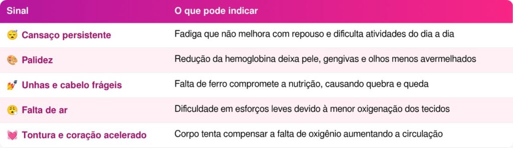 A anemia costuma se instalar de forma gradual, e muitas pessoas se acostumam com os sintomas sem perceber que algo está errado. Os sinais mais comuns incluem: