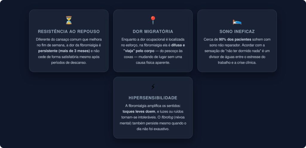 - Duração e padrão da dor: O cansaço do trabalho alivia depois de um bom descanso e desaparece em um final de semana. Na fibromialgia, a dor persiste por mais de três meses, sem causa física identificável, e não responde de forma satisfatória ao repouso.