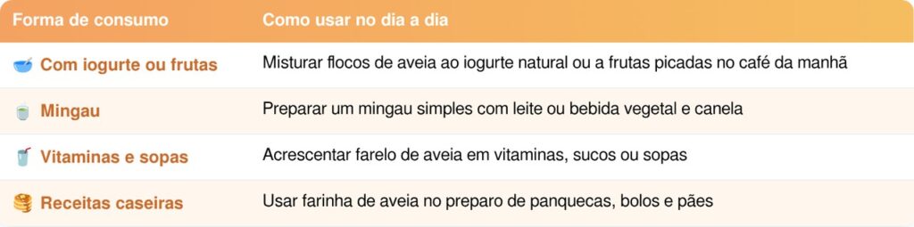 A aveia é um alimento versátil que combina com diversas refeições. Incorporar o cereal no dia a dia não exige receitas elaboradas nem grandes mudanças na rotina. Algumas sugestões que facilitam o consumo regular incluem: