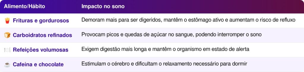 Nem todos os alimentos têm o mesmo impacto sobre o sono noturno. Alguns exigem um esforço digestivo maior e liberam substâncias que estimulam o organismo em vez de acalmá-lo. Os mais problemáticos incluem: