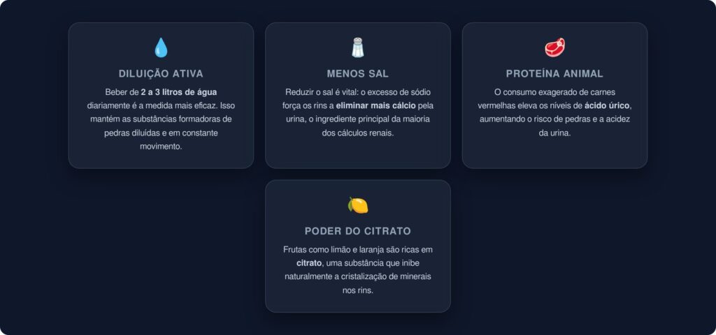 Organizações de saúde como a Fundação Nacional do Rim dos Estados Unidos e o Sistema Nacional de Saúde britânico apontam medidas comprovadas para prevenir cálculos renais: