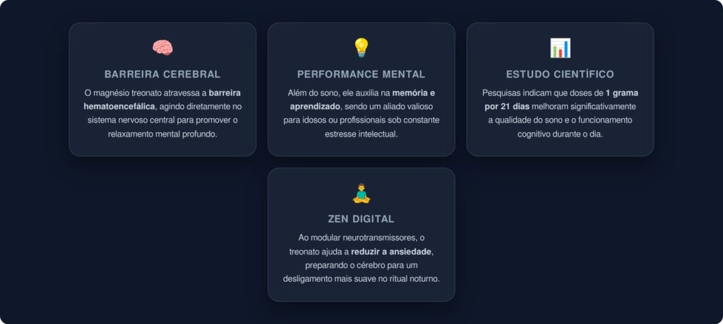 O magnésio treonato é formado pela ligação do mineral com o ácido treônico, um derivado da vitamina C. O grande diferencial dessa forma está na sua capacidade de atravessar a barreira hematoencefálica, alcançando diretamente o sistema nervoso central. Isso o torna particularmente eficaz para quem busca melhorar a qualidade do sono, reduzir a ansiedade e favorecer o relaxamento mental.