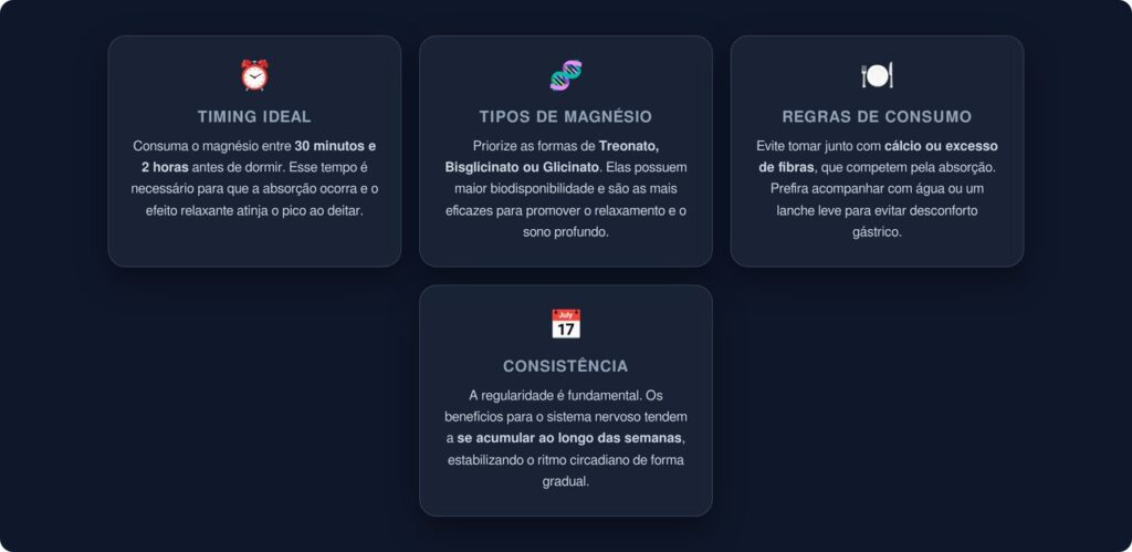 A recomendação mais comum entre especialistas é tomar o magnésio voltado para sono entre 30 minutos e 2 horas antes de ir para a cama. Esse intervalo permite que a absorção aconteça e que o efeito relaxante esteja presente quando você se deitar. Algumas orientações práticas ajudam nesse ajuste: