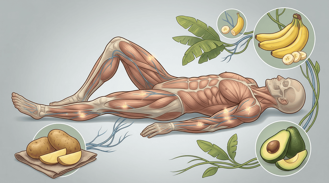 O potássio é responsável por transmitir sinais elétricos entre os nervos e os músculos. Quando seus níveis estão equilibrados, os músculos conseguem contrair durante o dia e relaxar completamente à noite, facilitando o adormecer. Sem potássio suficiente, os músculos permanecem tensos e podem apresentar espasmos involuntários, especialmente durante o sono.