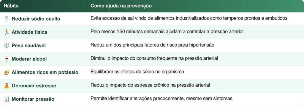 Dois dos hábitos que mais impactam a pressão arterial são a alimentação e a forma como lidamos com o estresse. Dietas ricas em sódio e pobres em potássio favorecem o aumento da pressão, enquanto uma alimentação equilibrada, inspirada em padrões como a dieta DASH, pode reduzir os números de forma significativa. Alguns ajustes simples que ajudam incluem: