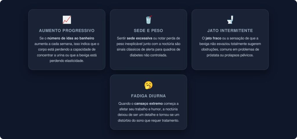 Alguns sinais indicam que a noctúria merece atenção médica imediata. É importante buscar avaliação quando: