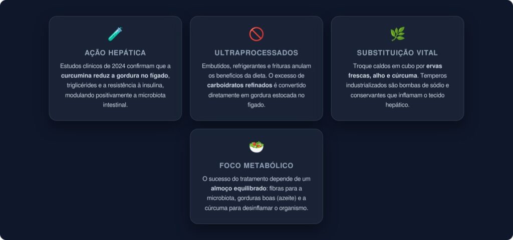 Entre os ingredientes citados, a cúrcuma é um dos mais amplamente estudados pela ciência. O ensaio clínico randomizado Curcumin supplementation alleviates hepatic fat content associated with modulation of gut microbiota-dependent bile acid metabolism in patients with nonalcoholic simple fatty liver disease, publicado no American Journal of Clinical Nutrition em 2024, avaliou 80 pacientes com esteatose hepática ao longo de 24 semanas. Os participantes que receberam curcumina apresentaram redução significativa no conteúdo de gordura hepática, além de queda nos triglicérides, glicemia de jejum e marcadores de resistência à insulina, em comparação ao grupo placebo. Segundo esse ensaio clínico randomizado, a curcumina também promoveu alterações benéficas na microbiota intestinal, o que reforça o papel do tempero no tratamento nutricional da esteatose como parte de um acompanhamento multidisciplinar.