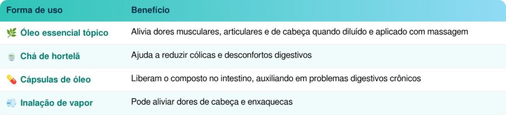 A hortelã pode ser utilizada de diferentes maneiras, dependendo do tipo de dor e da orientação do profissional de saúde. As formas mais comuns e estudadas incluem: