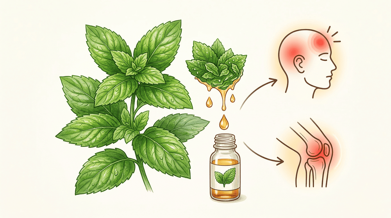 O mentol é o composto responsável pela sensação de frescor característica da hortelã. Quando entra em contato com a pele ou as mucosas, ele ativa receptores que normalmente respondem ao frio. Essa ativação gera uma sensação de resfriamento local que funciona como um analgésico natural, reduzindo a percepção da dor na região aplicada. Esse mecanismo é o mesmo que explica por que pomadas e géis à base de mentol são amplamente utilizados para dores musculares e articulares.