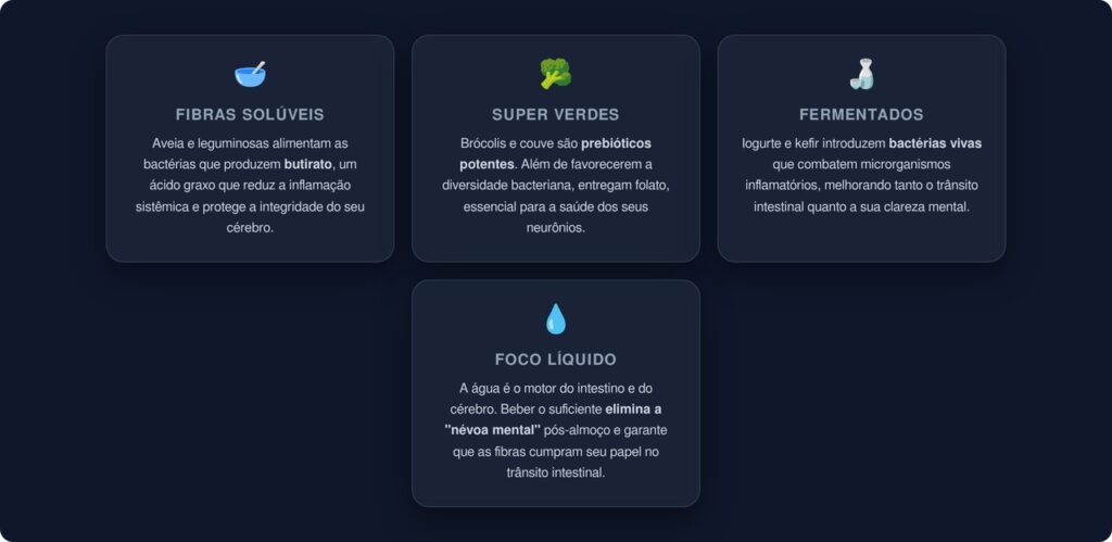 - Fibras solúveis (aveia, feijão, lentilha, abobrinha): Alimentam diretamente as bactérias produtoras de butirato no intestino, melhoram o trânsito e reduzem a inflamação sistêmica.