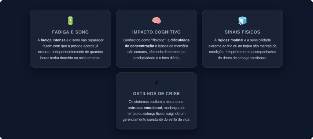 Além da dor generalizada, a fibromialgia costuma vir acompanhada de outros sintomas que afetam a rotina. Entre os mais frequentes estão: