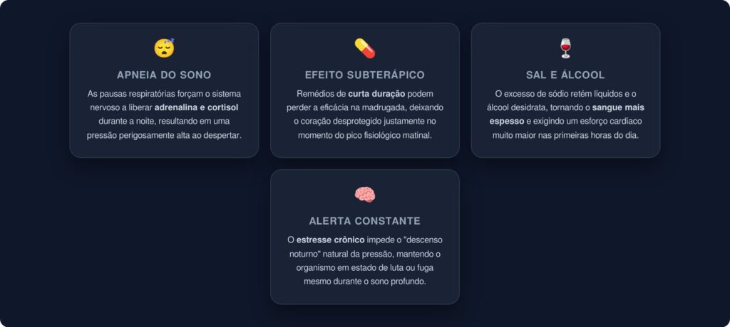 Alguns hábitos e condições de saúde podem tornar a elevação da pressão ao acordar ainda mais pronunciada. Entre os principais estão:
