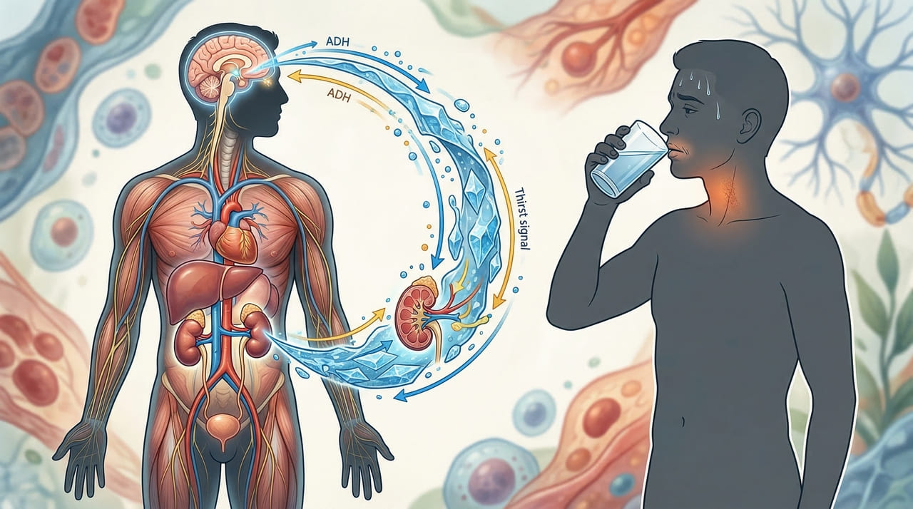 O cérebro monitora constantemente a concentração de água e sais no sangue. Quando essa concentração aumenta, mesmo que ligeiramente, o cérebro envia o sinal de sede para estimular a ingestão de líquidos e, ao mesmo tempo, libera um hormônio que orienta os rins a reter mais água. Quando esse sistema funciona bem, a sede passa assim que a pessoa se hidrata adequadamente.