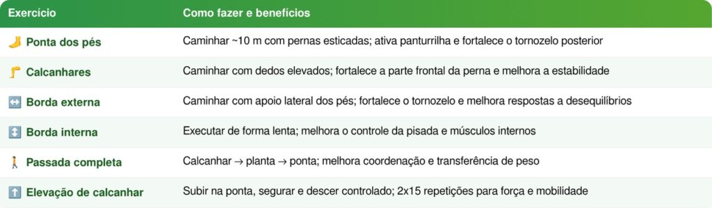 Tornozelos fortes também contribuem para uma pisada mais controlada e reativa, o que melhora o desempenho geral na corrida. Especialistas recomendam que o trabalho de fortalecimento seja incluído no aquecimento, antes de cada sessão de treino, para ativar a musculatura e preparar a articulação para o esforço.