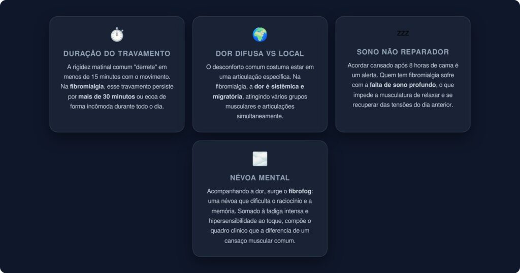 • Qualidade do sono: quem tem rigidez comum acorda descansado; na fibromialgia, o sono não é reparador, mesmo com muitas horas dormidas