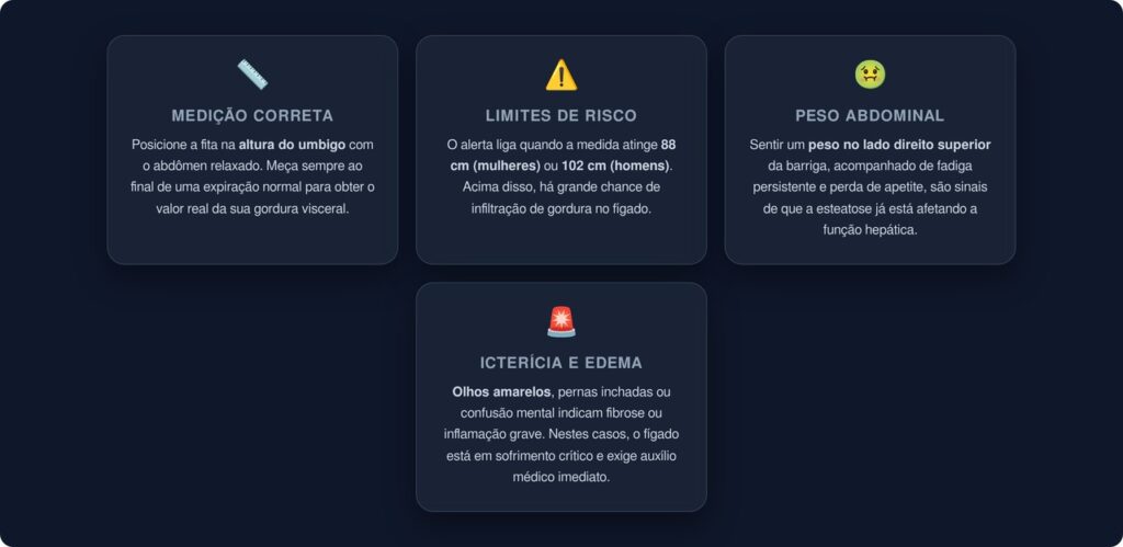 Valores acima desses limites indicam acúmulo de gordura visceral, o tipo de gordura que se deposita ao redor dos órgãos internos, incluindo o fígado. Quanto maior a circunferência, maior a probabilidade de o fígado já estar infiltrado por células de gordura.