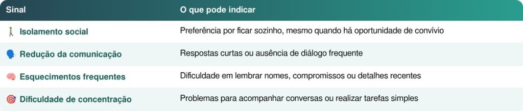 Outro sinal importante é quando a pessoa idosa começa a se afastar de amigos e familiares de forma gradual. O desinteresse por encontros sociais, conversas e atividades que antes eram prazerosas pode indicar um quadro depressivo ou o início de um processo de declínio das funções mentais. Alguns comportamentos que merecem atenção da família incluem:
