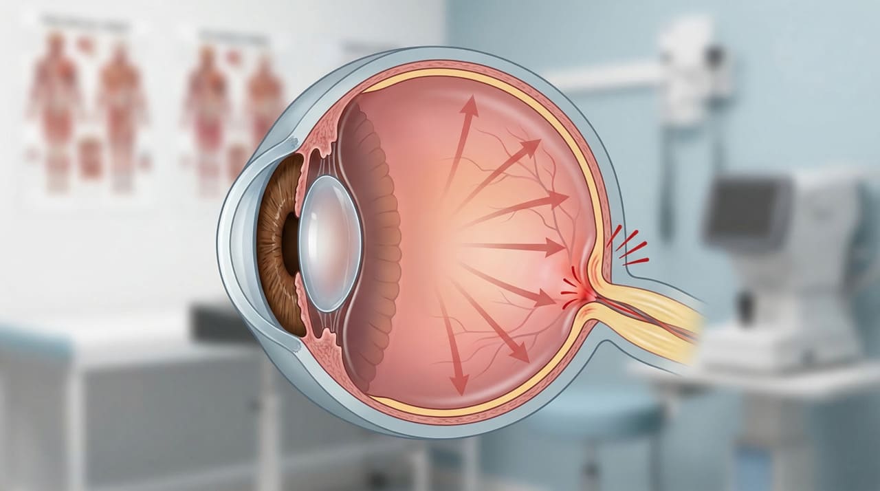 O glaucoma ocorre quando o líquido natural do interior do olho não drena corretamente, provocando aumento da pressão dentro do globo ocular. Com o tempo, essa pressão elevada danifica o nervo responsável por levar as imagens do olho até o cérebro. O resultado é uma perda progressiva da visão, começando pelas laterais do campo visual e avançando até o centro.