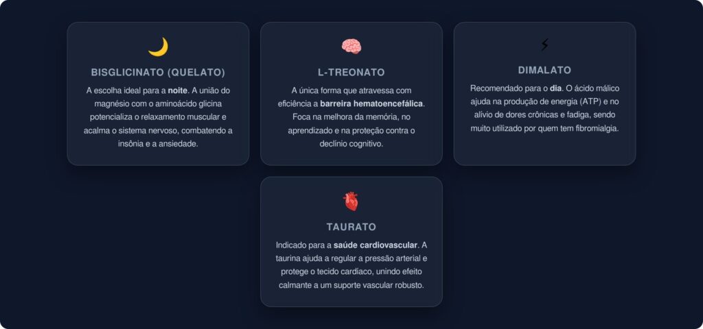 Se o objetivo é especificamente “apagar” à noite com músculos relaxados, o bisglicinato oferece a combinação mais favorável: alta absorção intestinal, ação direta no sistema nervoso e efeito sinérgico da glicina no sono.