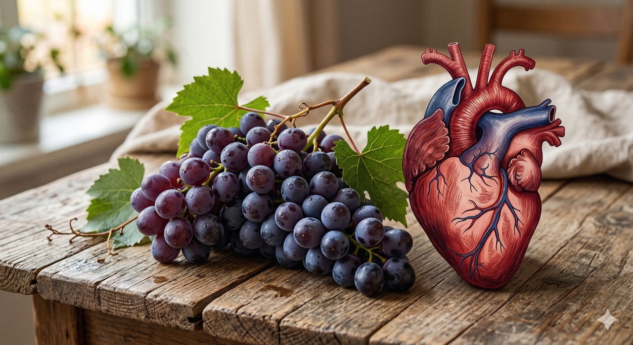 O resveratrol presente na uva roxa é estudado por ajudar na circulação e na saúde do coração.