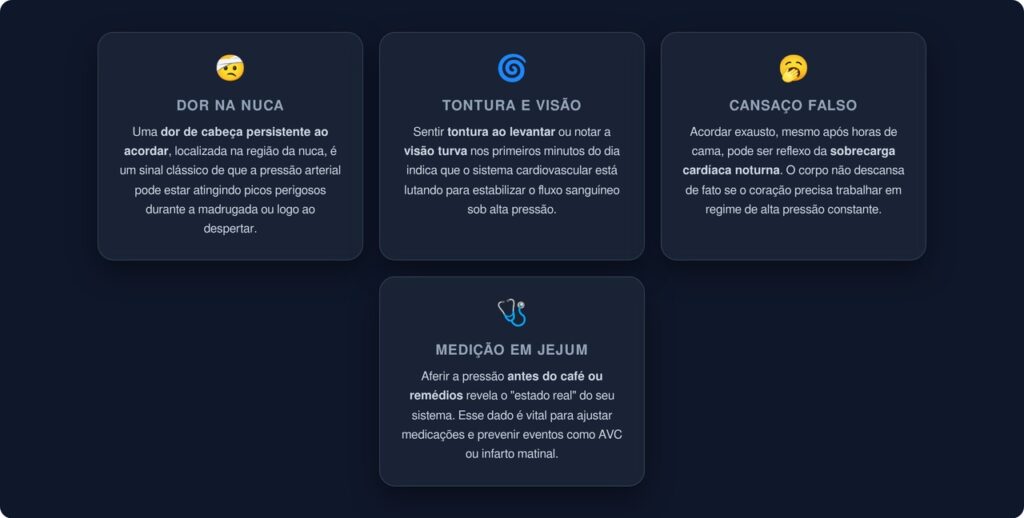 Nem sempre o pico matinal apresenta sintomas claros. Porém, alguns sinais podem indicar que a pressão está subindo além do esperado ao acordar: