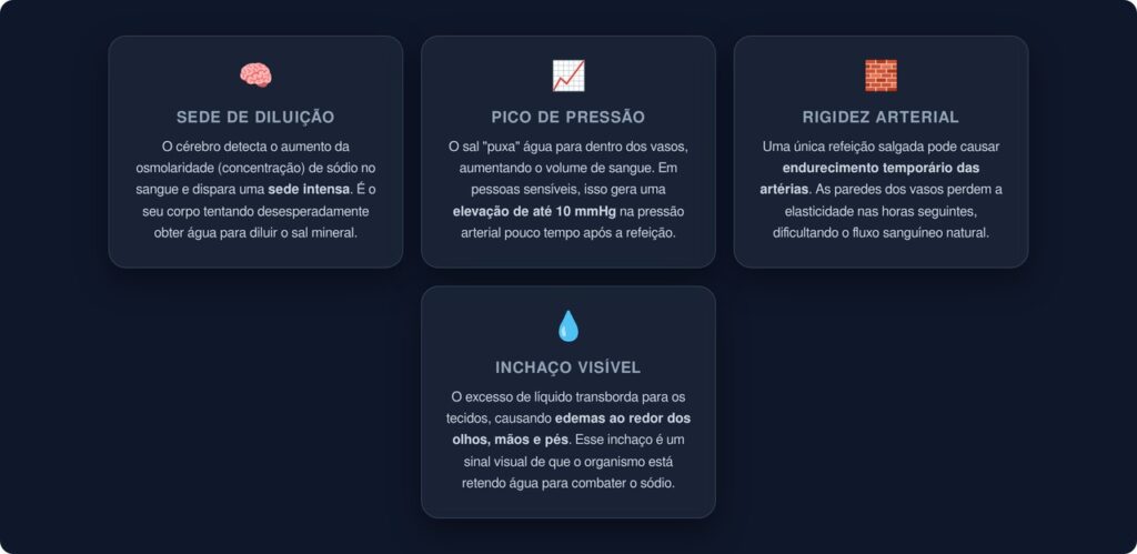 Quando uma grande quantidade de sódio entra na corrente sanguínea, o organismo reage de forma imediata. O corpo começa a reter mais água para diluir o excesso do mineral, aumentando o volume de líquido nos vasos sanguíneos. Essa sobrecarga eleva a pressão exercida contra as paredes das artérias. Alguns efeitos podem ser percebidos logo após a refeição: