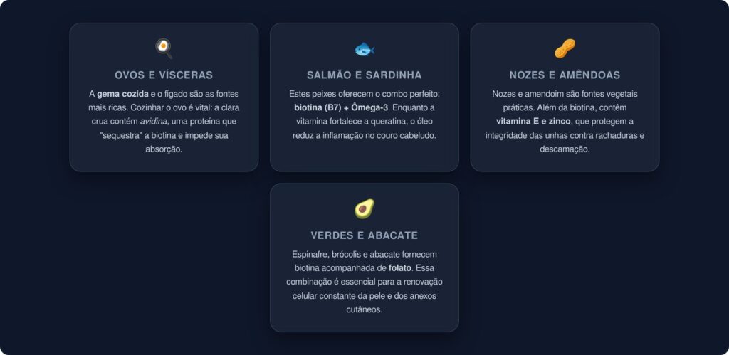 - Gema de ovo cozido: uma das fontes mais concentradas de biotina, desde que o ovo seja consumido cozido (a clara crua contém uma substância que impede a absorção)