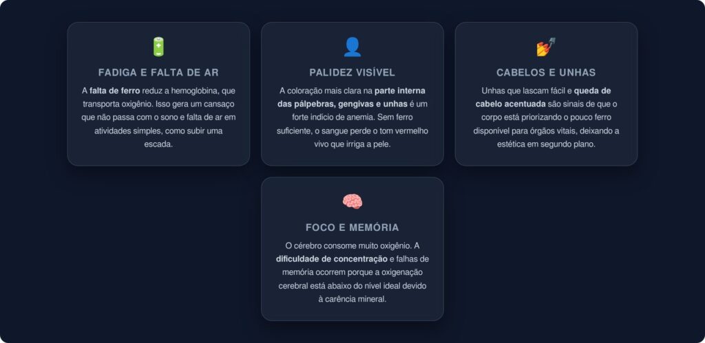 A compulsão por gelo raramente aparece isolada. Quando está associada à anemia, outros sintomas costumam estar presentes e ajudam a levantar a suspeita: