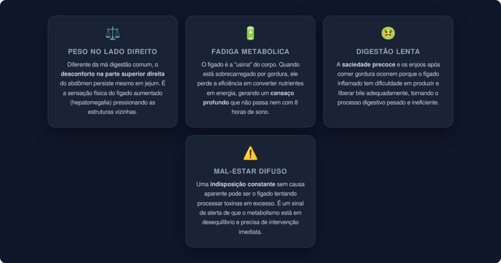 A esteatose hepática é traiçoeira justamente porque seus sintomas iniciais se confundem com problemas digestivos comuns. Porém, existem sinais que diferenciam o inchaço simples de um fígado que já está acumulando gordura além do normal: