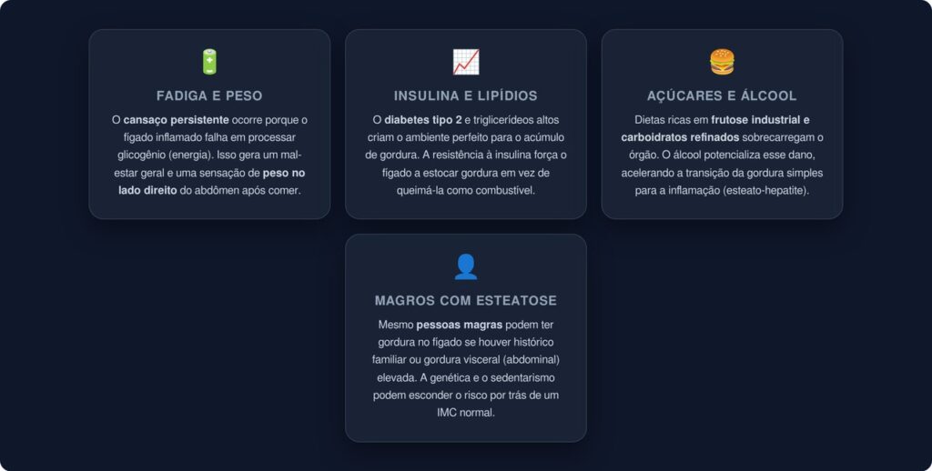 Alguns fatores aumentam significativamente as chances de acumular gordura no fígado. Conhecer esses riscos permite agir de forma preventiva: