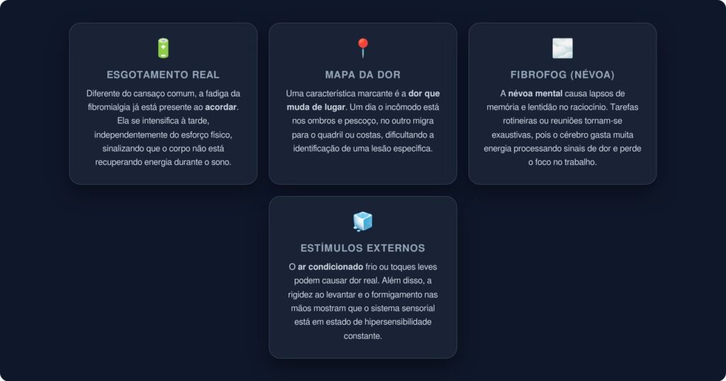 No ambiente de trabalho, a fibromialgia costuma se manifestar de formas que são facilmente confundidas com cansaço comum ou falta de disposição. Reconhecer esses sinais é o primeiro passo para buscar ajuda adequada: