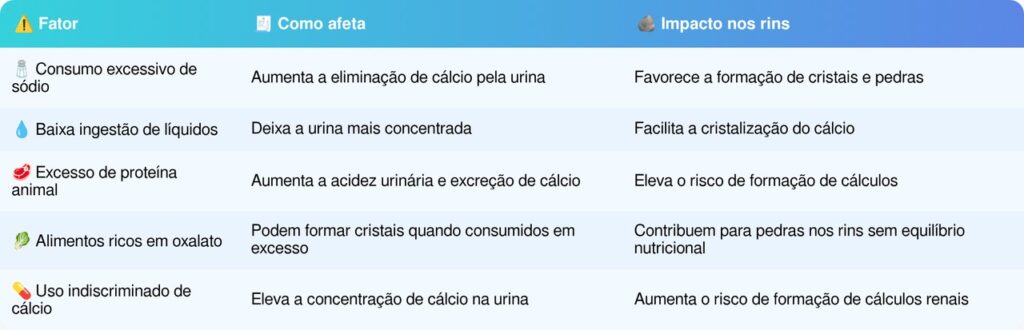Alguns hábitos alimentares favorecem a formação de cálculos de cálcio nos rins. Os principais fatores que merecem atenção são: