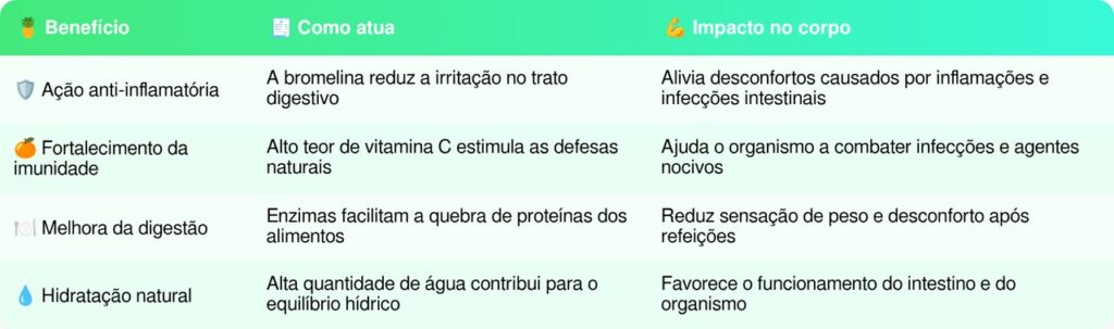 O potencial antiparasitário é apenas uma das vantagens que o abacaxi oferece ao sistema digestivo. Essa fruta tropical reúne nutrientes e compostos que atuam em diversas frentes para manter o intestino saudável:
