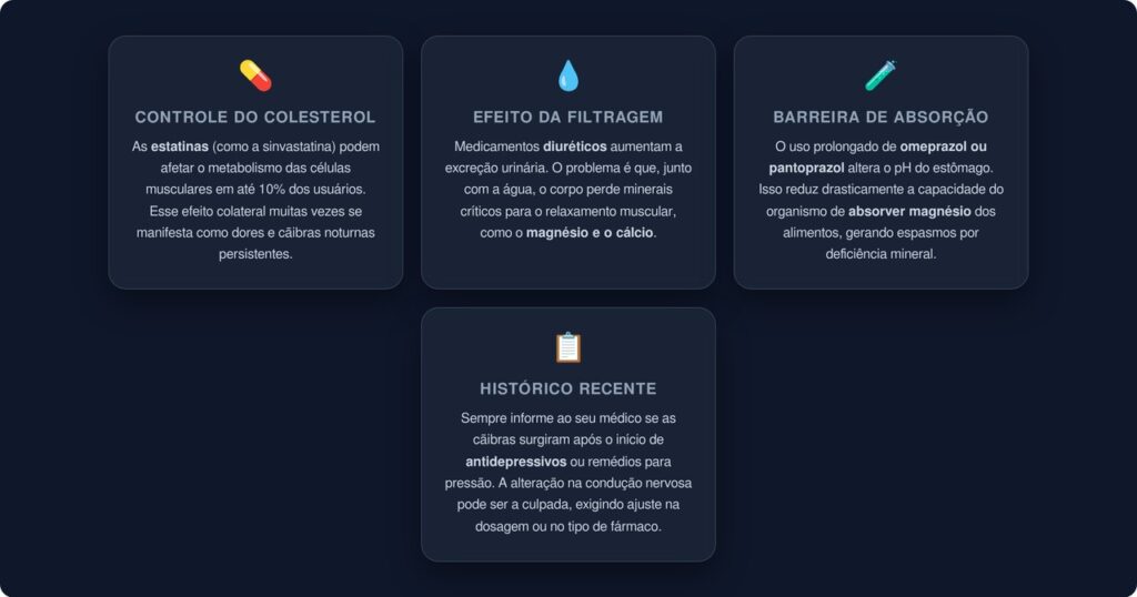 Diversos medicamentos amplamente utilizados podem provocar cãibras noturnas como efeito colateral, e a maioria das pessoas nunca faz essa conexão. Os mais associados a esse problema são: