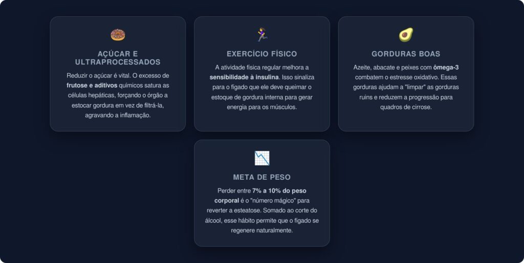 - Reduzir o consumo de açúcar e ultraprocessados, que alimentam o acúmulo de gordura hepática