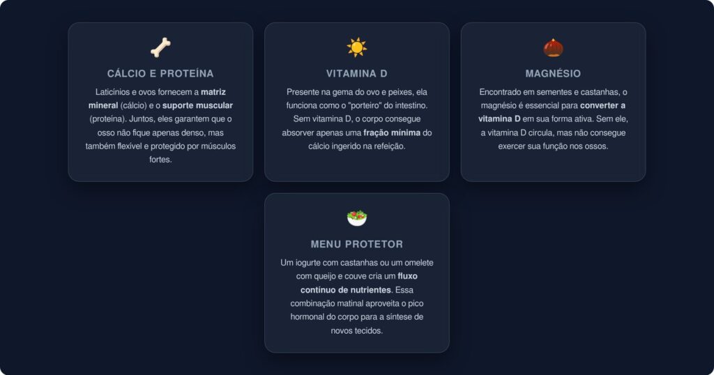A primeira refeição do dia é uma oportunidade estratégica para reunir os nutrientes que trabalham em conjunto pela saúde dos ossos. Quando combinados no mesmo período, eles potencializam a absorção uns dos outros. Os principais são: