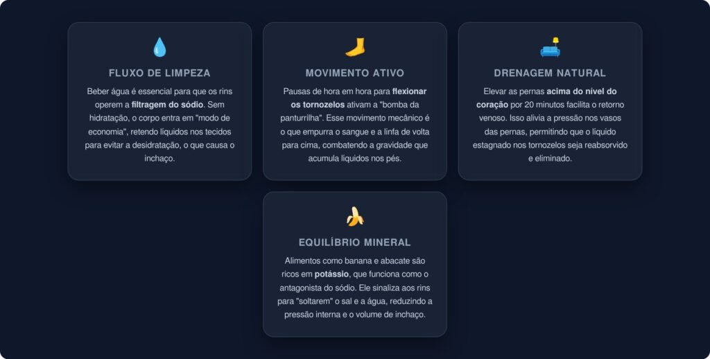 A técnica do banho de contraste alivia o desconforto imediato, mas prevenir o inchaço ao longo do dia exige hábitos consistentes. Algumas práticas simples que fazem diferença comprovada incluem: