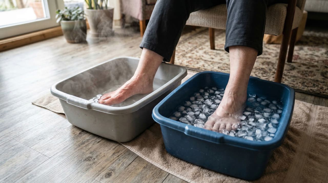 Para aplicar a técnica em casa, basta seguir esses passos: encher dois recipientes grandes o suficiente para cobrir os pés e os tornozelos, um com água morna (nunca fervendo) e outro com água fria ou gelada. Mergulhar os pés na água morna por 3 minutos, depois transferir para a água fria por 1 minuto. Repetir essa alternância de 3 a 4 vezes, sempre terminando na água fria. A sessão inteira leva cerca de 15 minutos e pode ser feita ao chegar em casa.