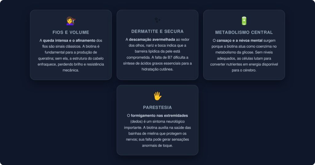 As unhas quebradiças costumam ser o sinal mais visível, mas não o único. A deficiência de biotina pode se manifestar de outras formas que muitas vezes passam despercebidas no dia a dia: