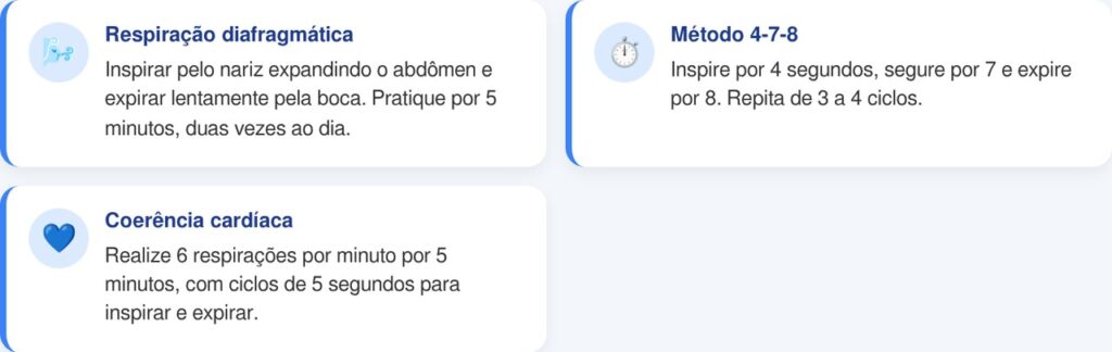 Exercícios de respiração lenta e profunda são uma das formas mais acessíveis e rápidas de reduzir a pressão arterial. Ao respirar de forma consciente e controlada, o corpo ativa o sistema nervoso responsável pelo relaxamento, diminuindo a frequência cardíaca e relaxando os vasos sanguíneos. As técnicas mais estudadas pela ciência incluem: