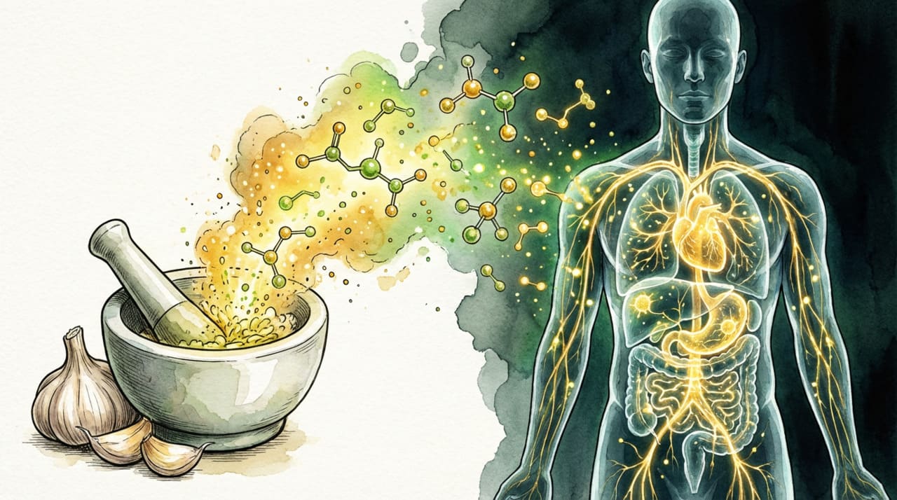 A alicina, principal composto ativo do alho, não existe no dente inteiro. Ela só é formada quando o alho é esmagado, picado ou ralado, pois esse processo rompe as células e permite que uma reação natural aconteça. O ponto crucial é que, após esmagar o alho, ele precisa descansar por pelo menos 10 minutos ao ar livre antes de ser aquecido. Esse tempo permite que a alicina se estabilize.