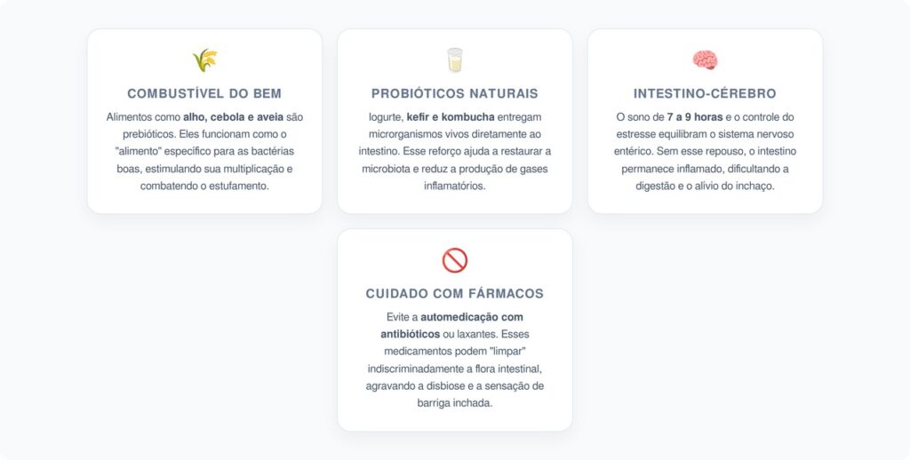Reverter a disbiose e aliviar o inchaço crônico depende de mudanças consistentes nos hábitos diários. Algumas estratégias com respaldo científico podem ajudar nesse processo: