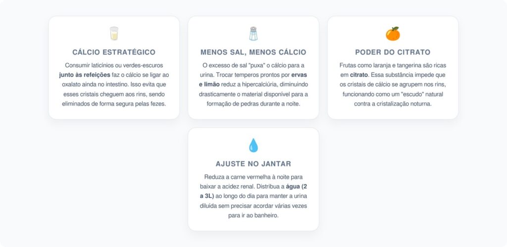 As mudanças mais eficazes para reduzir a concentração de cálcio nos rins durante o sono são feitas ao longo do dia, nas escolhas alimentares de cada refeição: