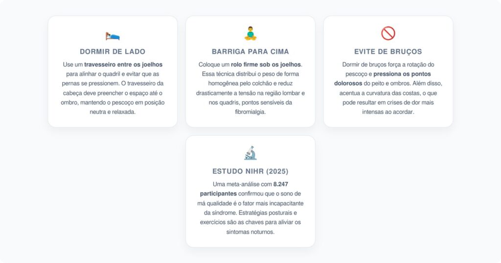 • De lado com travesseiro entre os joelhos: esta é considerada a posição mais favorável para quem tem fibromialgia. O travesseiro entre as pernas mantém o quadril alinhado e evita que os joelhos se pressionem. A altura do travesseiro da cabeça deve preencher o espaço entre o ombro e a orelha, mantendo o pescoço em posição neutra.
